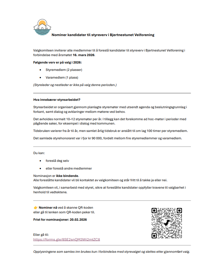 Nominasjon til styreverv Publisert av Styret Bjertnestunet Velforening den 28.01.26. Nominer kandidater til styreverv i Bjertnestunet Velforening